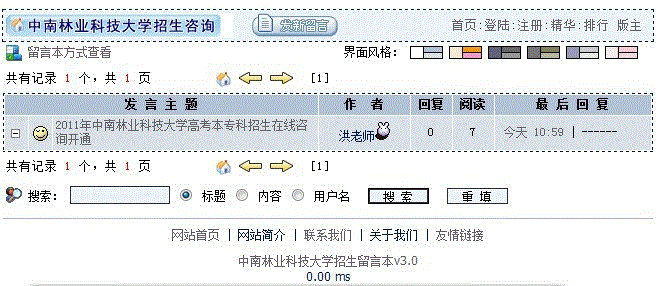 2013年中南林業(yè)科技大學(xué)招生咨詢留言板已經(jīng)關(guān)閉,錄取正在進(jìn)行中,請留意相關(guān)信息 !